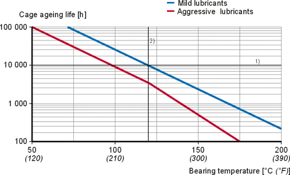 Therefore, whether polyamide cages are suitable for a specific application depends on the operating conditions and life requirements. The classification of lubricants into “aggressive” and “mild” is reflected by the “permissible operating temperature” for cages made of glass fibre reinforced PA66 with various lubricants table 1. The permissible operating temperature in table 1 is defined as the temperature that provides a cage ageing life of at least 10 000 operating hours.